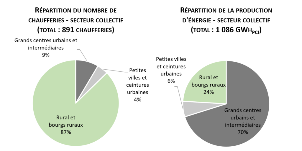 La majorité des chaufferies biomasses sont utilisées pour le chauffage de locaux tertiaires, d’administrations, d’immeubles, etc. (chaufferies dites « collectives »). Ces chaufferies sont majoritairement implantées en milieu rural. Par contre, la puissance moyenne des chaufferies est bien plus élevée en zone urbaine (2 667 kW) qu’en milieu rural (156 kW). Autrement dit, les zones urbaines comptent beaucoup moins de chaufferies biomasse, mais leur puissance et leur production d’énergie est bien plus importante. Il est plus facile de mutualiser une chaufferie biomasse de puissance importante dans des zones urbaines où les usages se concentrent (logements collectifs, bâtiments publics, infrastructures sportives, etc.), pour éviter les pertes liées aux réseaux.