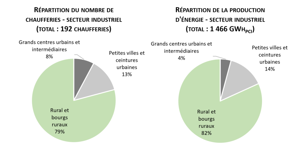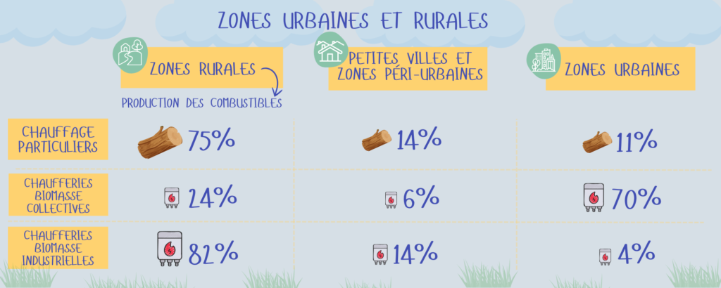 Le chauffage domestique en secteur rural et l’industrie représentent des postes de consommation importants et sont implantés loin des villes. Cependant, l’implantation de réseaux de chaleur, plus rentable économiquement et énergétiquement dans des zones densément peuplées, représente un poste de consommation important et majoritairement urbain.