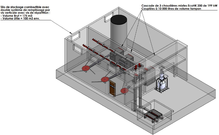 - 3 chaudières bois de 200 kW, dont une de secours